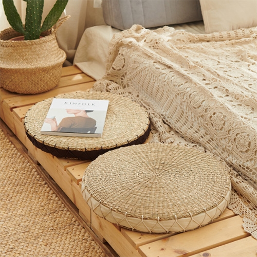 쿠션이 들어있는 천연 소재의 방석으로 테두리에 패브릭으로 마감하였습니다. 천연 소재로 내츄럴한 분위기가 살아 있어 인테리어 소품으로도 매력적인 제품입니다.